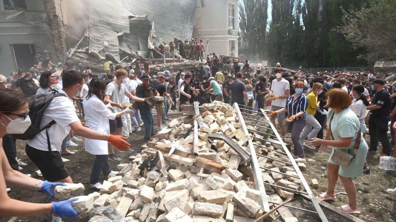 Рятувальники та волонтери на місці влучання по "Охматдиту". Фото: РБК Україна