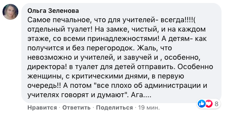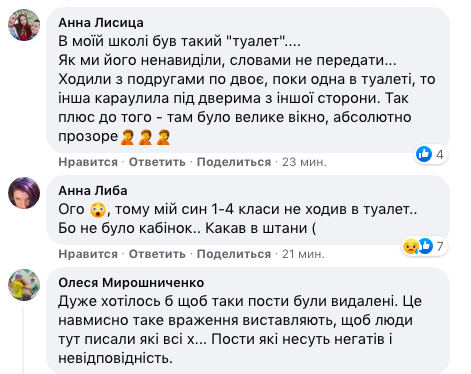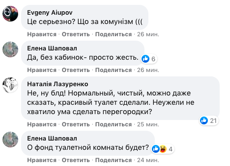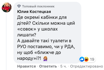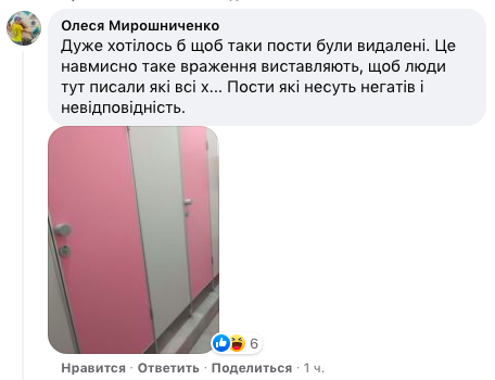 "Скільки шкіл в Україні отримали на горіхи за такі туалети без індивідуальних кабінок. А Деснянська рада Києва нічого про це не чула. Ну просто розумово цнотливі люди," - написала вона.