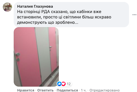 Водночас, деякі з юзерів написали, що інформація за 9 липня вже не є актуальною і кабінки встановили. Навіть доклали світлину, яка ніби-то була зроблена у дівчачій вбиральні. Однак, чи так насправді - поки невідомо. На момент публікації цієї новини, на сторінці Деснянської РДА оновленої інформації не було знайдено.
