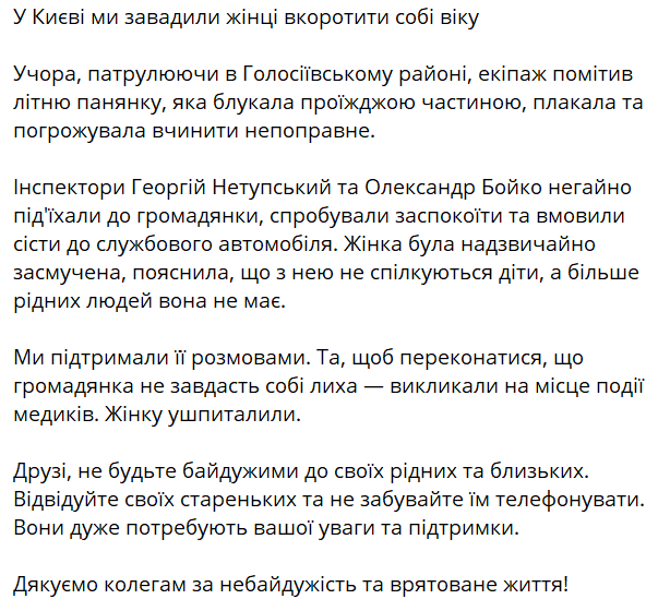 "Патрулюючи в Голосіївському районі, екіпаж помітив літню жінку, яка блукала проїжджою частиною, плакала та погрожувала вчинити самогубство", — йдеться у повідомленні.