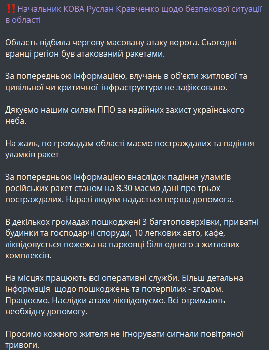"За попередньою інформацією внаслідок падіння уламків російських ракет станом на 08:30 маємо дані про трьох постраждалих. Наразі людям надається перша допомога", — йдеться у повідомленні.
