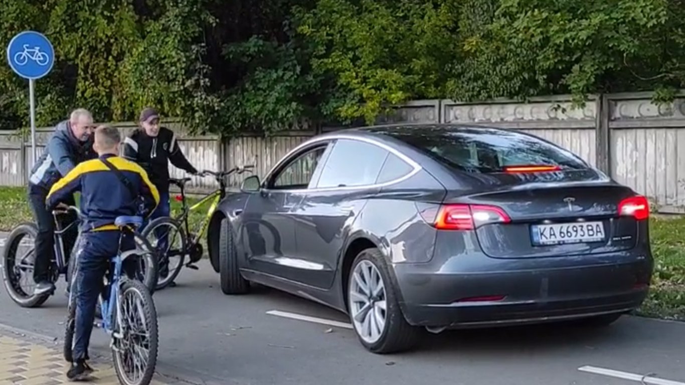Так, водитель упорно пытался проехаться по велосипедной дорожке, но трое мужчин на "байках" остановились перед ним и перегородили путь. При этом у них возник спор, во время которого к велоактивистам присоединился случайный прохожий.
