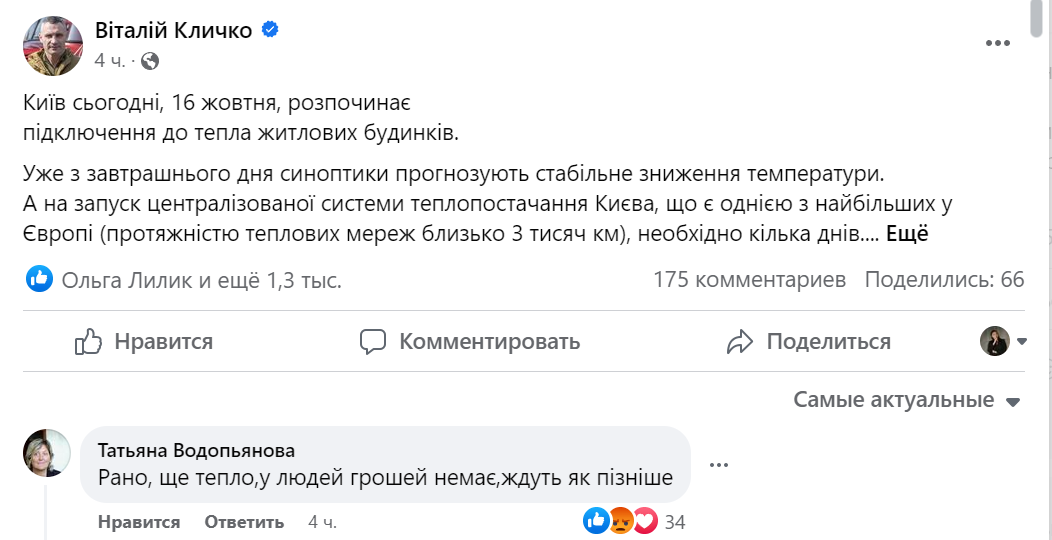 "А вы спросили у киевлян? Еще достаточно тепло и с отоплением можно подождать. А то снова будем открывать окна и топить улицу. Но кто-то ну очень хочет лишних деньжат еще в карман напихать", — говорится в комментарии.