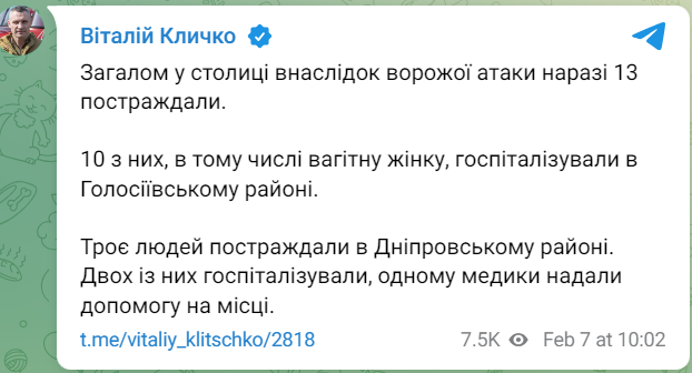 Из-за ракетного удара РФ в Киеве количество пострадавших увеличилось до 11 человек. Как известно, Россия нанесла удары по столице в среду, 7 февраля.
