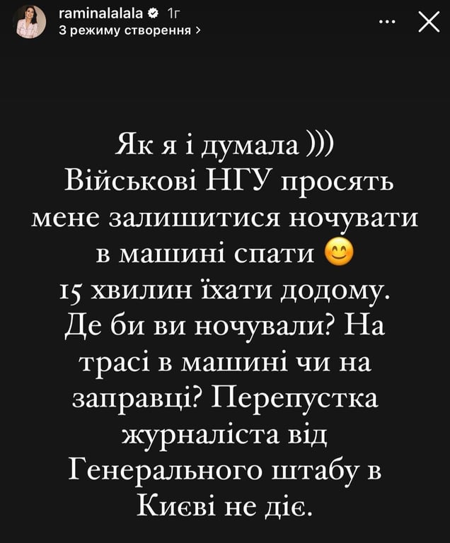 Военные Национальной гвардии попросили Рамину остаться ночевать в машине, хотя у нее был пропуск журналиста от Генштаба, а ехать домой оставалось 15 минут.