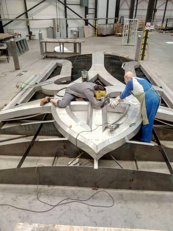 Сотрудники завершают работу над украинским Тризубом, который будет висеть на щите "Родины-Матери", как сообщил министр культуры и информационной политики Украины Александр Ткаченко, за 28 миллионов гривен.