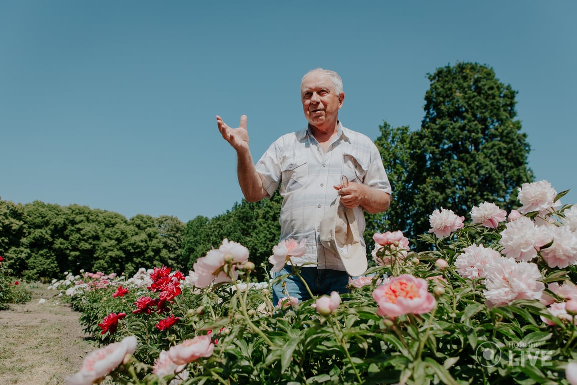 Василь Горобець біля півоній "Жемчужна розсип". Фото: Ольга Кононенко/Новини.LIVE