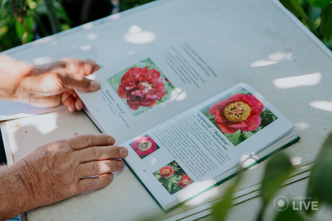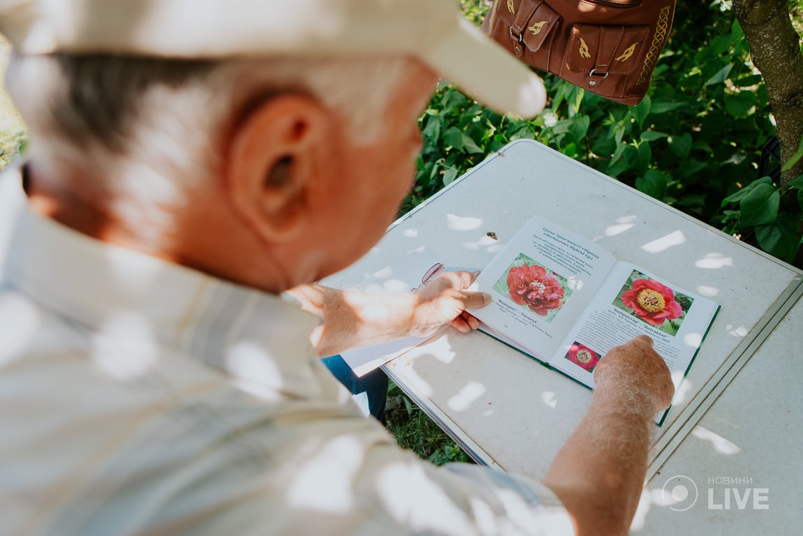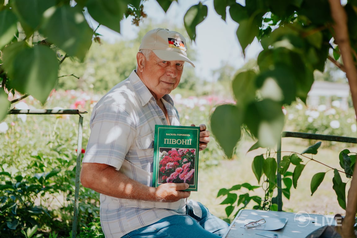 Василь Горобець у "зеленому офісі" на колекційній ділянці зі своєю книгою про півонії. Фото: Ольга Кононенко/Новини.LIVE