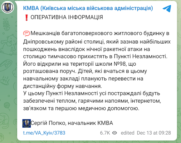 Жителів багатоповерхівки в Дніпровському районі Києва тимчасово прихистять у Пункті незламності. Як відомо, цей житловий будинок постраждав найбільше внаслідок нічної ракетної атаки на столицю.