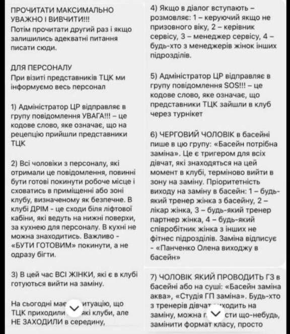 При візиті представників ТЦК ми інформуємо весь персонал. Адміністратор відправляє в групу повідомлення УВАГА!!! — це кодове слово, яке означає, що на рецепцію прийшли представники ТЦК.