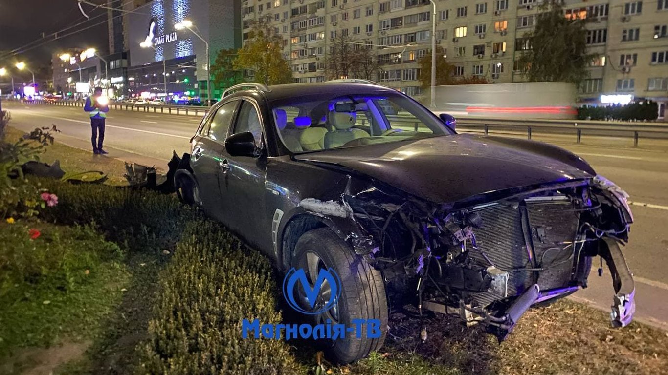 У Києві в ніч з 24 на 25 жовтня на проспекті Перемоги сталася аварія за участю автомобіля Infinity. Позашляховик протаранив відбійник, а потім наїхав на клумбу.